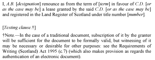 18In each of schedules (A.) (form of assignation of lease), (G.) (renunciation of lease) and (H.) (form of discharge of bond and assignation in security), in the note relating to subscription of the document in question—