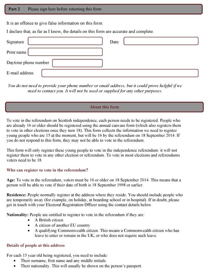 | Regulation 4 (forms) | In paragraph (1)— (a) sub-paragraph (b) is omitted, and (b) the reference to an election is to be read as a reference to an independence referendum. |