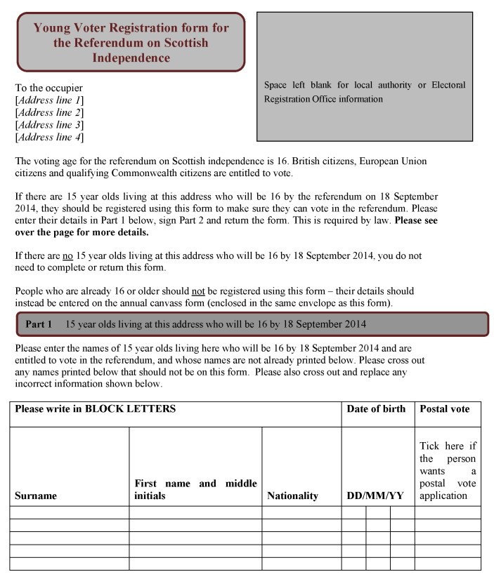 | Regulation 26 (applications for registration) | In paragraphs (1) to (3), the references to registration as a parliamentary or local government elector (or both) are to be read as references to registration in the register of young voters. |