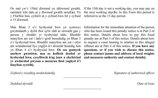(2) Caiff awdurdod pwysau a mesurau lleol ddefnyddio ffurflen hysbysiad cosb o faint neu ddyluniad sy’n wahanol i’r ffurflen yn yr Atodlen, ar yr amod nad yw cynnwys y ffurflen hysbysiad cosb yn cael ei newid o’r hyn a bennir yn yr Atodlen ac eithrio fel y’i caniateir gan baragraff (3).