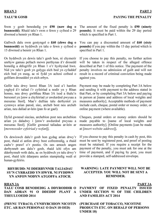 2.—(1) Mae’r ffurflen hysbysiad cosb yn yr Atodlen i’r Rheoliadau hyn wedi ei phennu mewn perthynas â’r drosedd o brynu neu geisio prynu tybaco, papurau sigaréts neu gynnyrch nicotin perthnasol ar ran unigolyn o dan 18 oed o dan adran 91 o Ddeddf Plant a Theuluoedd 2014(2).